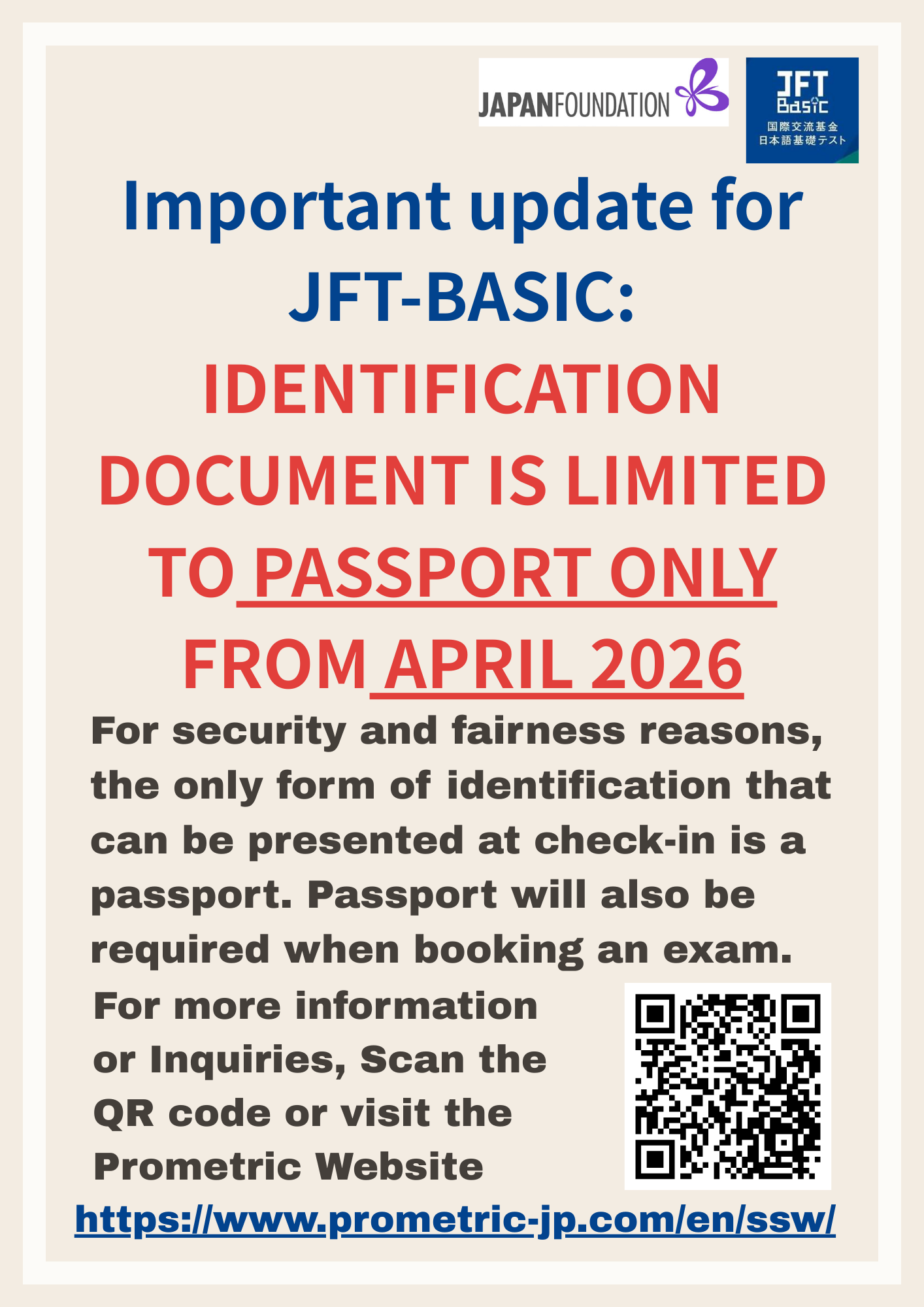 We would like to share important updated information for JFT-Basic test takers. From April 2026, your passport is the only form of identification you can use. Please refer to the flyer for more information.